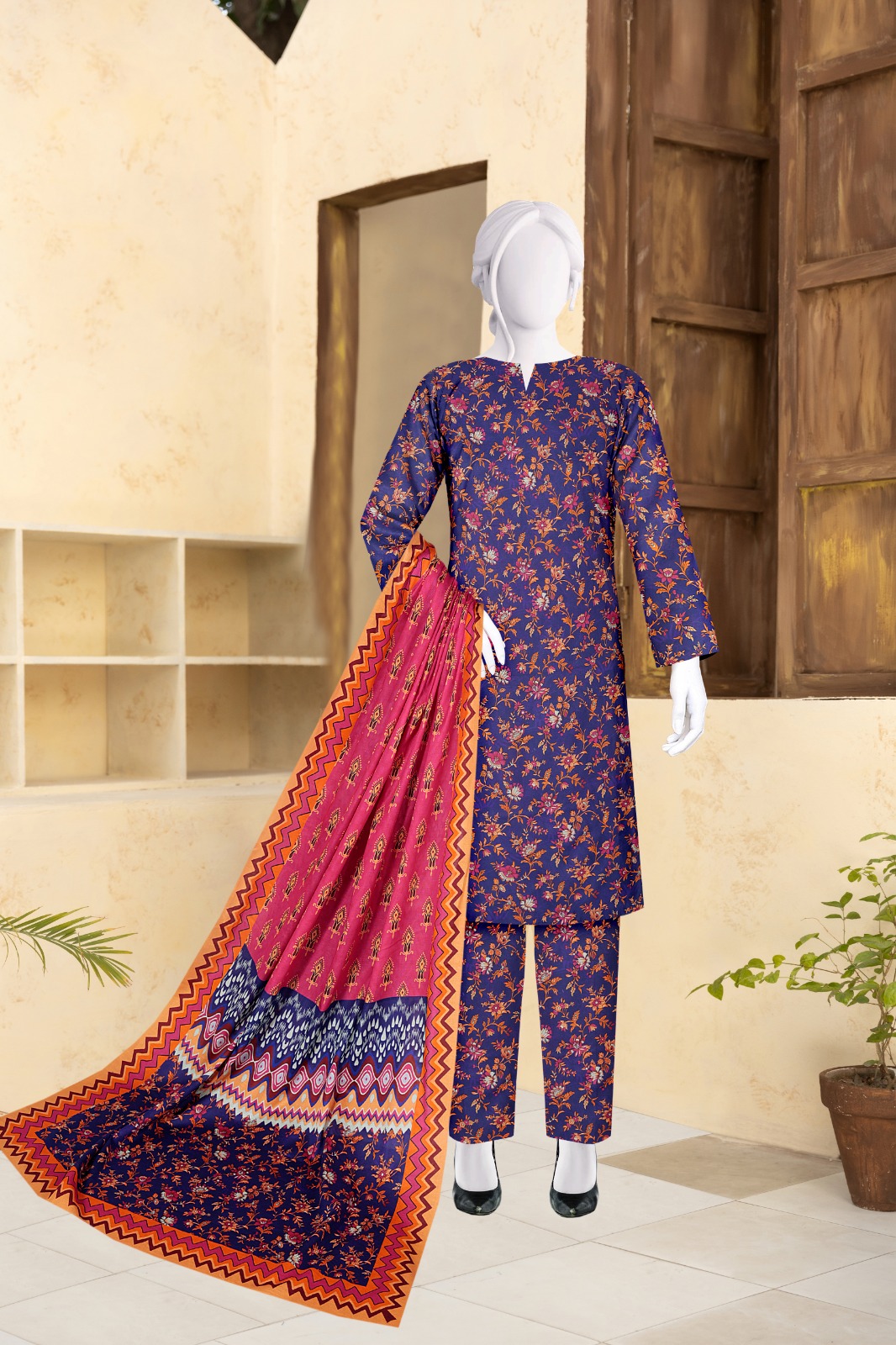 BAREEZE Elegant Unstitched 3PC Ladies Suit featuring a beautifully printed shirt, matching trousers, and a voil lawn dupatta. Perfect for customizing to your style and size. Ideal for casual or festive wear.