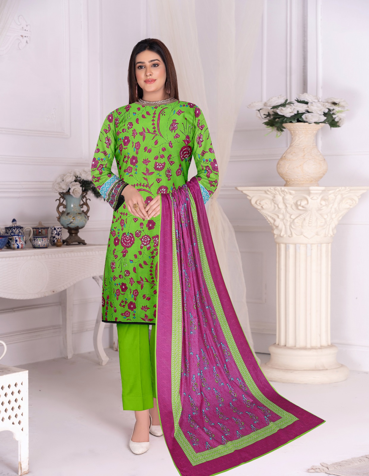 Our Ladies Lawn 3-Piece Suits offer the perfect blend of comfort and style. Featuring a printed lawn shirt, matching trousers, and a lightweight lawn dupatta – ideal for everyday wear or casual outings in the summer heat.”