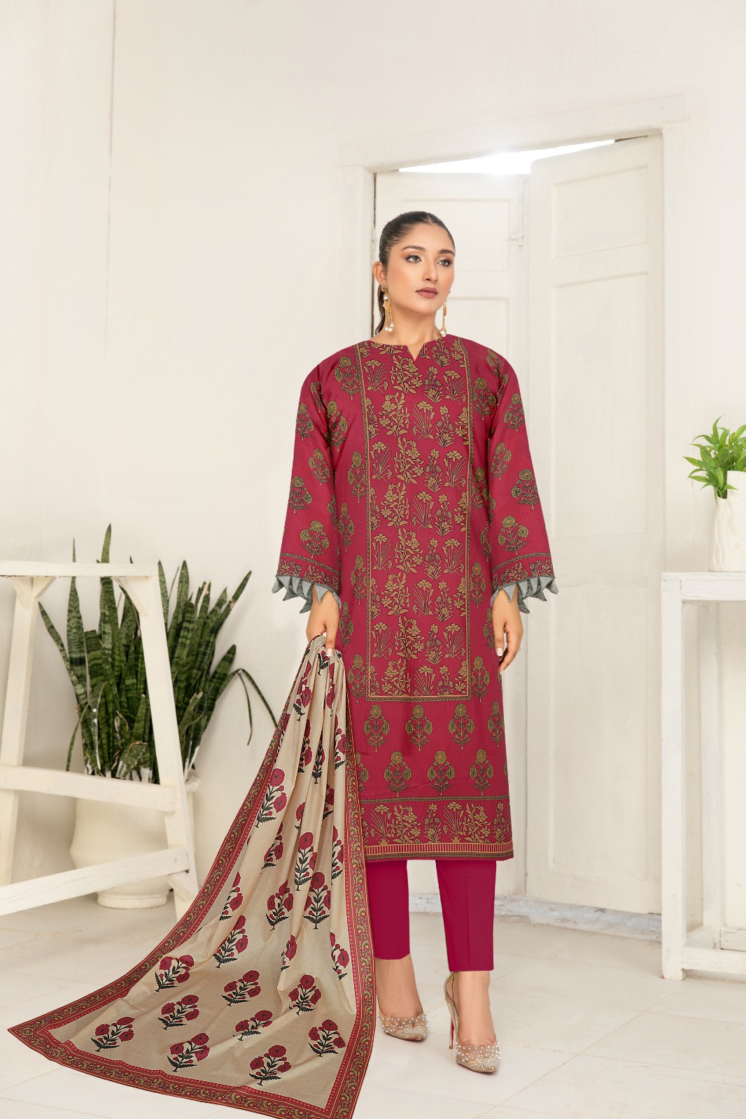 Our Ladies Lawn 3-Piece Suits offer the perfect blend of comfort and style. Featuring a printed lawn shirt, matching trousers, and a lightweight lawn dupatta – ideal for everyday wear or casual outings in the summer heat.”